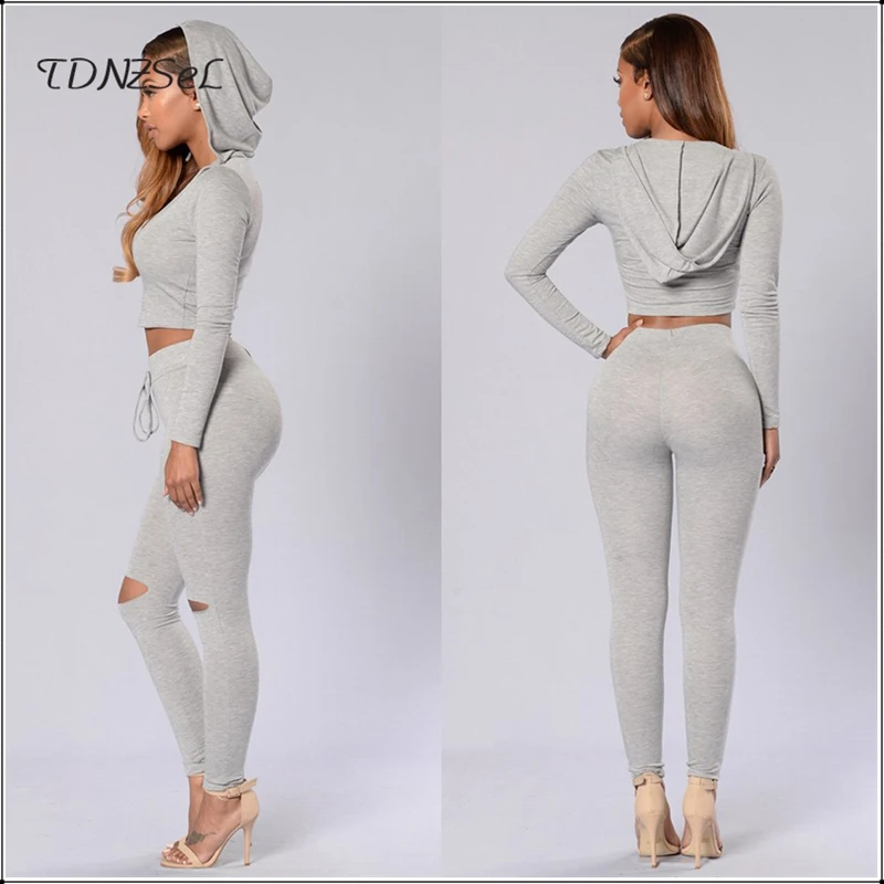 .Images for Cotton Women Trouser Skinny Sport Fitness 2 Two Piece Set Bodycon Long Sleeve Hoodies Crop Top Drawstring High Waist Slim Pants
