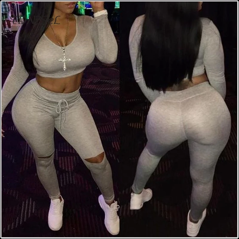 Limited Chance for Cotton Women Trouser Skinny Sport Fitness 2 Two Piece Set Bodycon Long Sleeve Hoodies Crop Top Drawstring High Waist Slim Pants