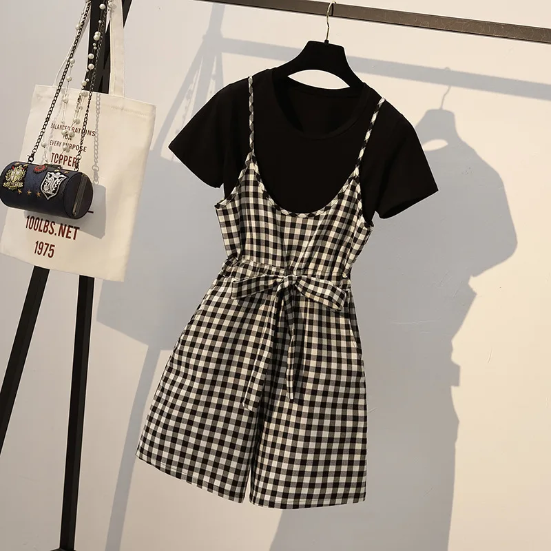 Cheap Price of GOPLUS Two Piece Set Women Summer Korean Vintage O-Neck Short Sleeve Tshirt Bow Plaid Short Overalls Shorts 2 Pieces Set Womens