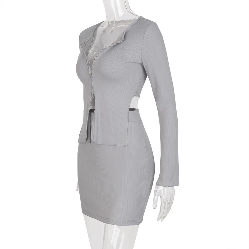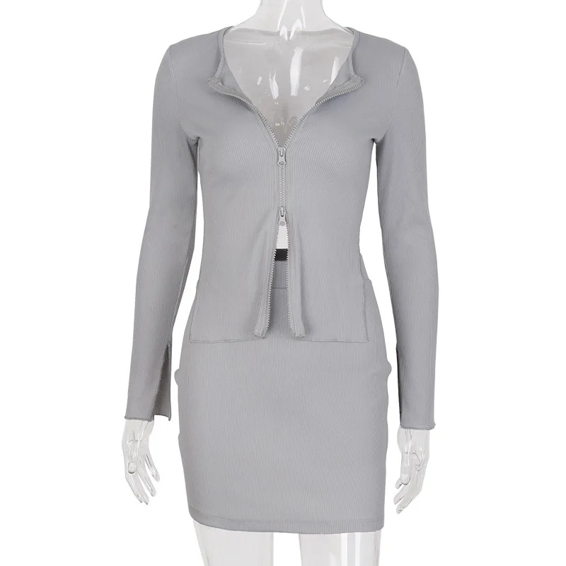 .Images of New Spring Summer Women's Casual Cargo Style Two piece sets Long Sleeve zipper Crop top Shirt?Elastic Sexy Mini Short Skirt set