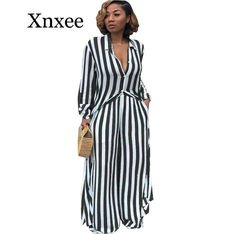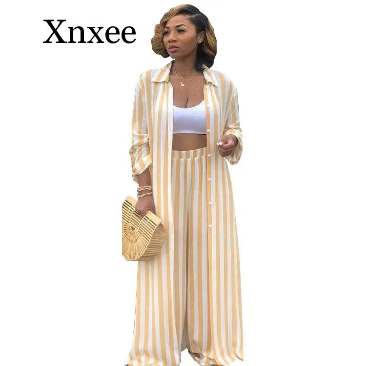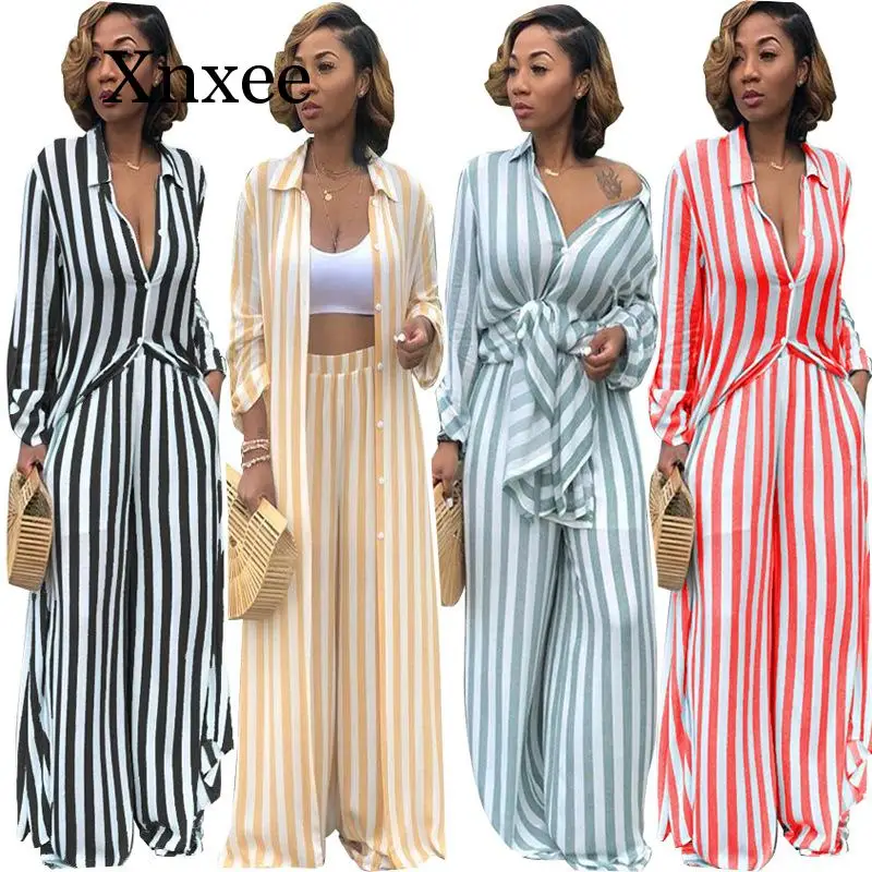 Offer Description of summer Women Casual Two Pieces Sets Long Sleeve Striped Blouse and Elastic Waist Wide Leg Pants Tracksuit Femme 2 Pieces Outfits