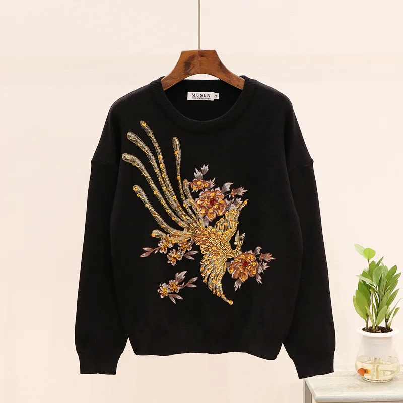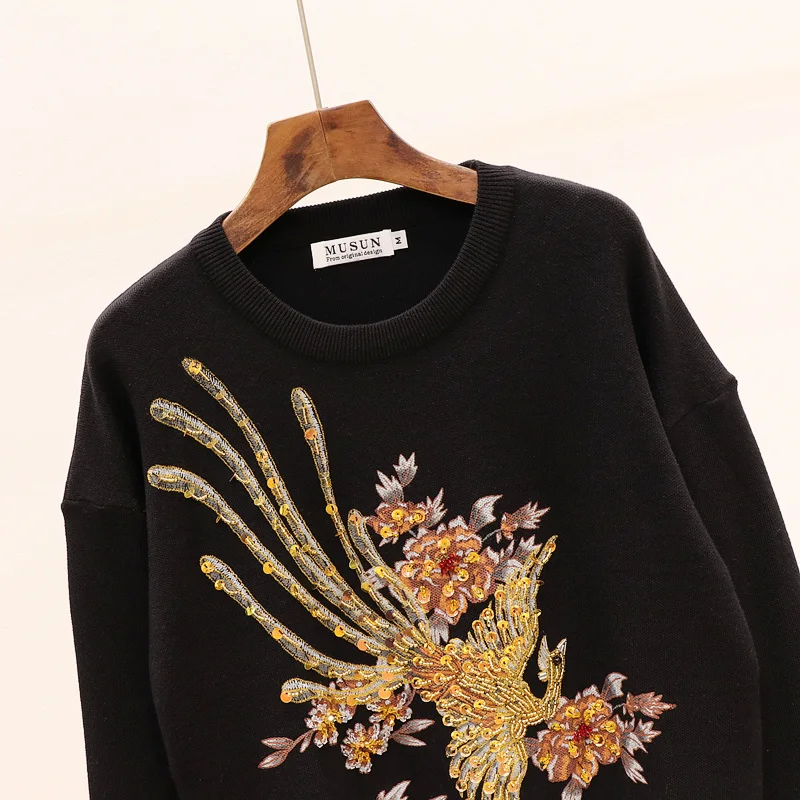 Addition Information of 2020 Spring Black Gray Knitted Tracksuit Women Beading Phoenix Long Sleeve Sweater + Long Pants 2 piece Set Women Loose Outfits