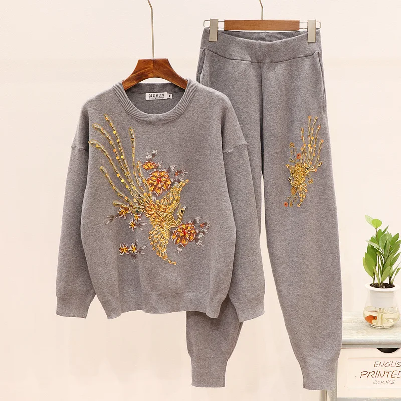Limited Price for 2020 Spring Black Gray Knitted Tracksuit Women Beading Phoenix Long Sleeve Sweater + Long Pants 2 piece Set Women Loose Outfits