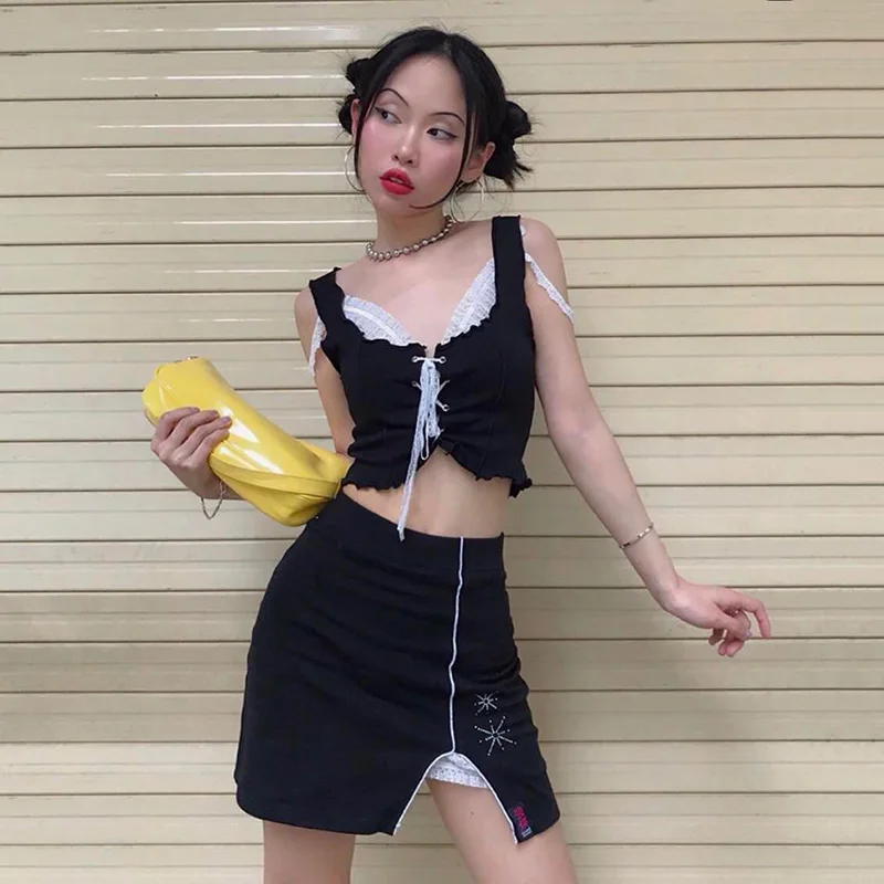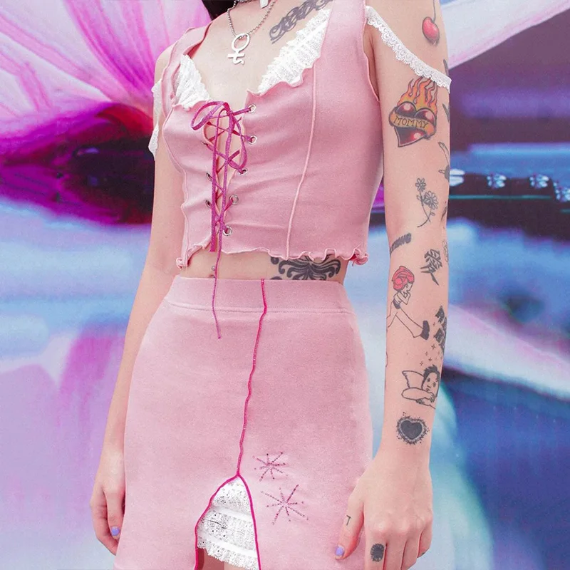 Addition Information of ALLNeon Fashion Sweet Straped Matching Sets Women's Lace up Crop Tops and Slit Mini Skirts Sets Vintage E-girl 2 Piece Sets Cute