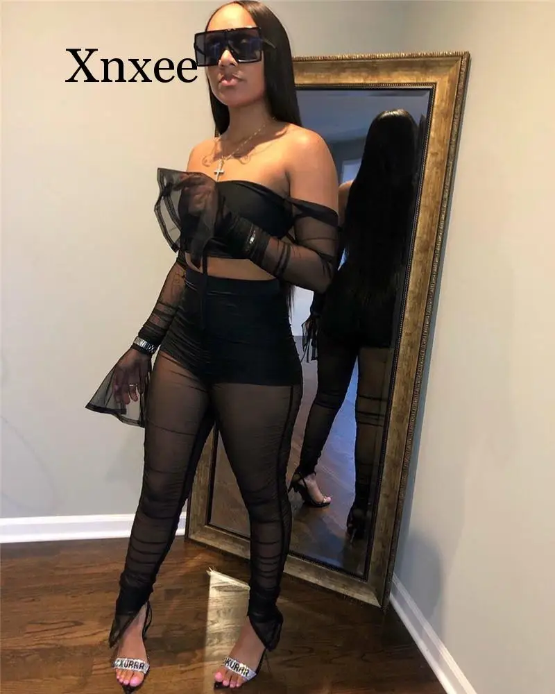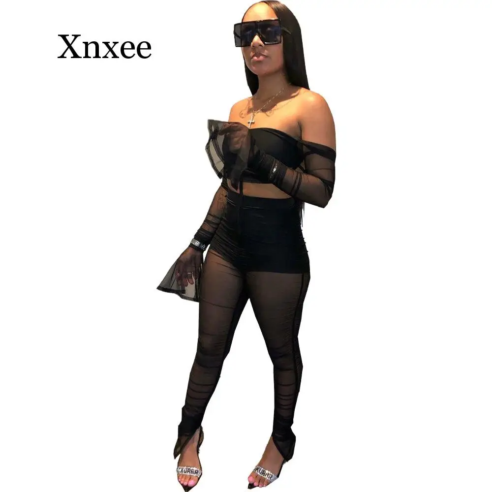 Addition Information of Women Sexy Sheer Mesh Ruched Two Piece Set Off Shoulder Flare Long Sleeve Crop Top High Waist Pencil Pants Club Suits white